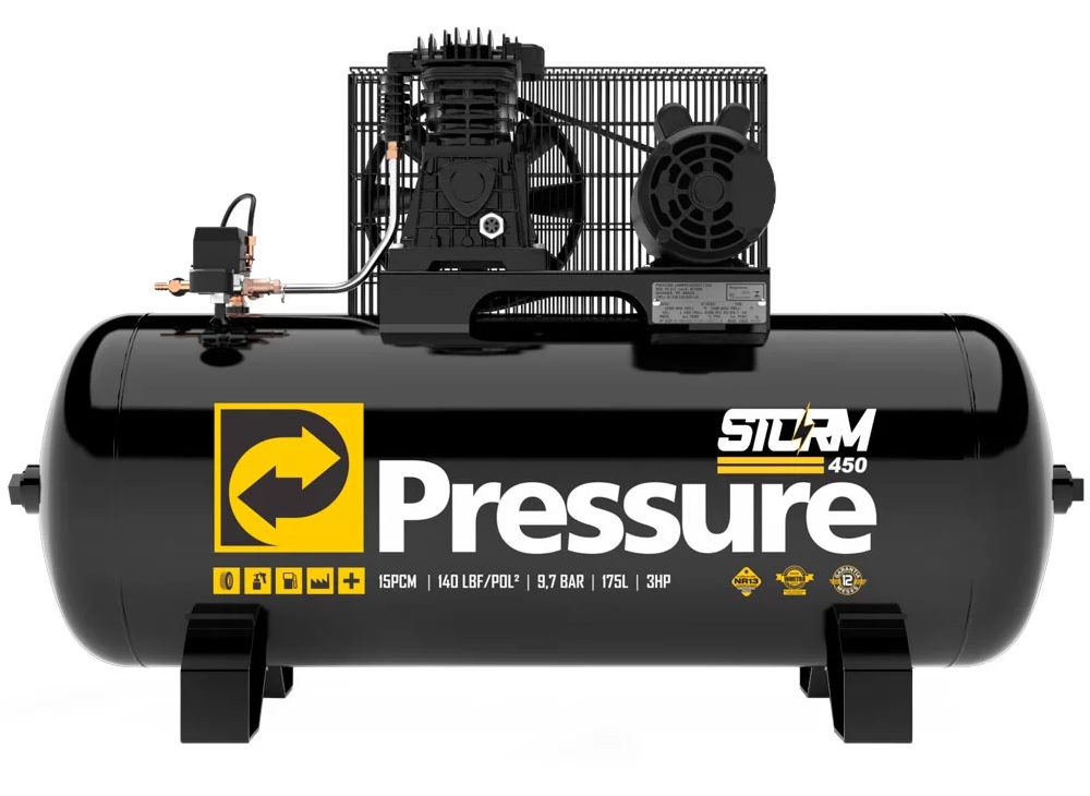 Compressor de ar Storm 450 é ideal para uso em oficinas mecânicas, marcenarias, borracharias, indústrias e locais que necessitem de ferramentas pneumáticas. Possui cabeçote em linha, que oferece menor temperatura de trabalho, menor tempo de enchimento e redução no nível de ruído e vibração. Conta com polia com maior quantidade de pás, para um fluxo maior de ar fresco (menor condensação do ar comprimido), grande durabilidade do compressor. Provido de volante maior, que garante eficiência no resfriamento do cabeçote e durabilidade dos componentes internos. Intercooler melhora a refrigeração interna do compressor.